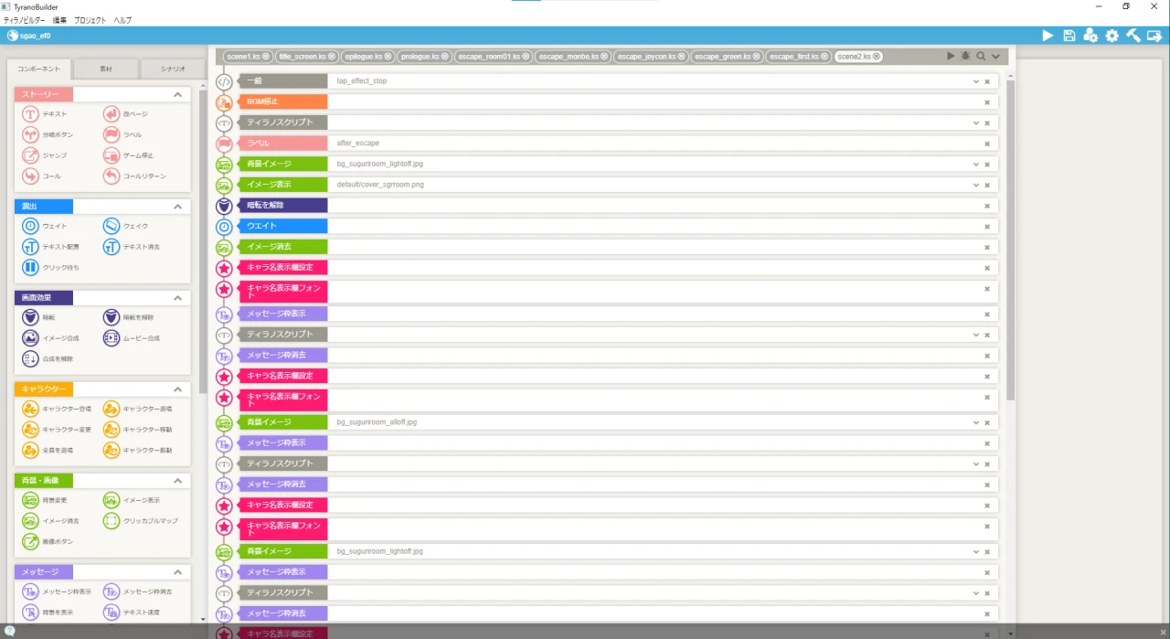 この左側のコンポーネントをドラッグアンドドロップするだけで直感的にノベルゲームができちゃうよ🎶というのがティラノビルダーの強みです。