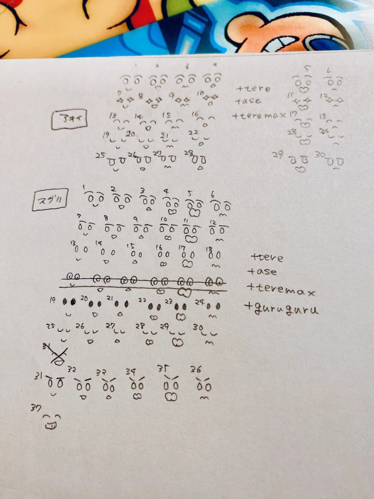 ※表情差分は最初「aoi_pokan01」「sgr_smile03」という感じで名付けていたのですが、どれがどれだか直感的じゃなかったので”目元”と”口元”の組み合わせを使う・使わないに関わらず全通りの番号を振って、表と見比べながら打ち込む形に変更しました。